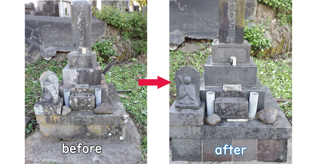 私は様々な石を洗ってきました。墓石をはじめ、コンクリート塀石碑、石仏像など施工を行いました。人は毎日お風呂、シャワーを浴びて綺麗にしていますが、石はさすがに毎日はできません。ただ数年に1度の掃除になるかもしれませんがそれは先代へのリスペクトだと思って代わりに作業をさせて頂いております。