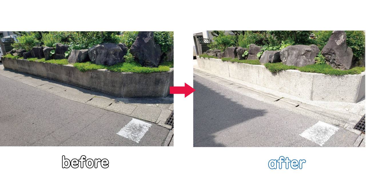 約1時間の施工でコンクリート塀がとても綺麗になりました。本来のコンクリートの白さが復活して家全体の見た目も明るくなりました。